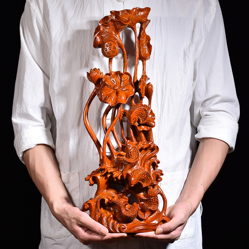 花梨木雕刻年年有鱼根雕摆件红木家居荷花动物装饰工艺品乔迁送礼热门设计联盟服务商