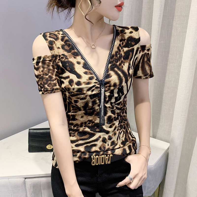 2021年夏季新款气质v领修身显瘦上衣设计感小众露肩短袖t恤女士潮热门设计联盟服务商